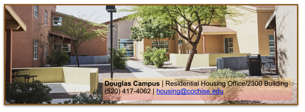 Commuting to campus is the only option at the majority of Cochise College’s educational centers, such as the Sierra Vista campus, Ft. Huachuca, Benson, and Wilcox educational centers. However, Douglas campus offers to students the opportunity for a traditional college experience by living on campus. Full-time students, enrolled in a minimum of 12 credits per semester are eligible to join our housing community and take advantage of all it has to offer.