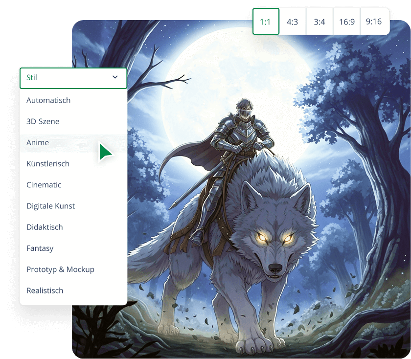 Wähle Stil und Seitenverhältnis: Ob realistische Fotos, Anime, Aquarell, Cyberpunk oder 3D-Kunst – wir erstellen es in der von dir gewünschten Größe.