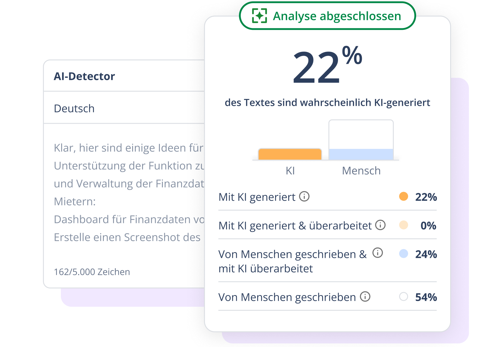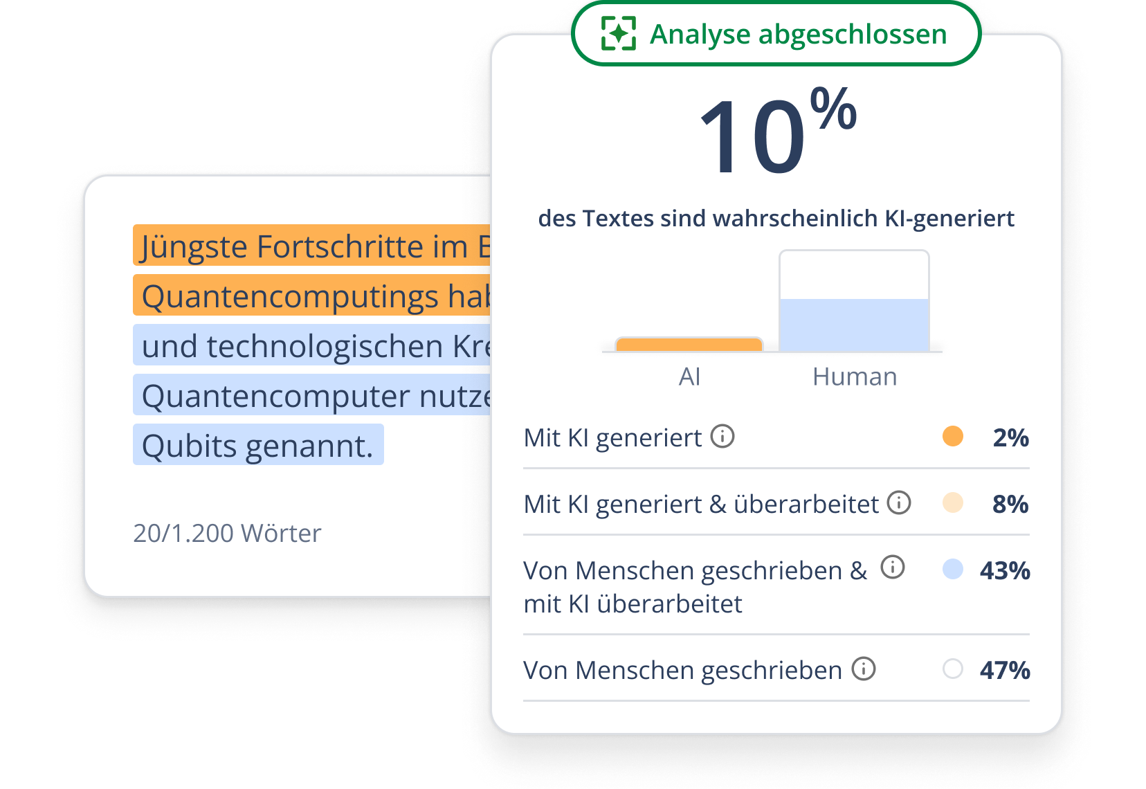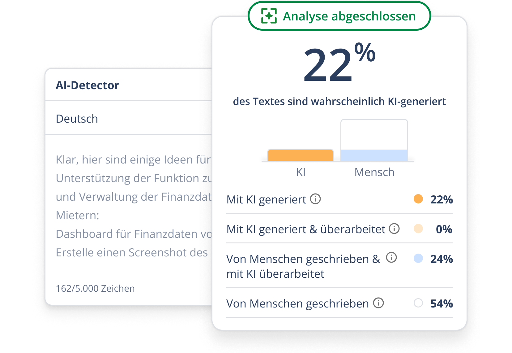 Heutzutage stammen Texte selten zu 100 % von Menschen oder KI. Unser Detector berücksichtigt das und liefert faire Einschätzungen.
