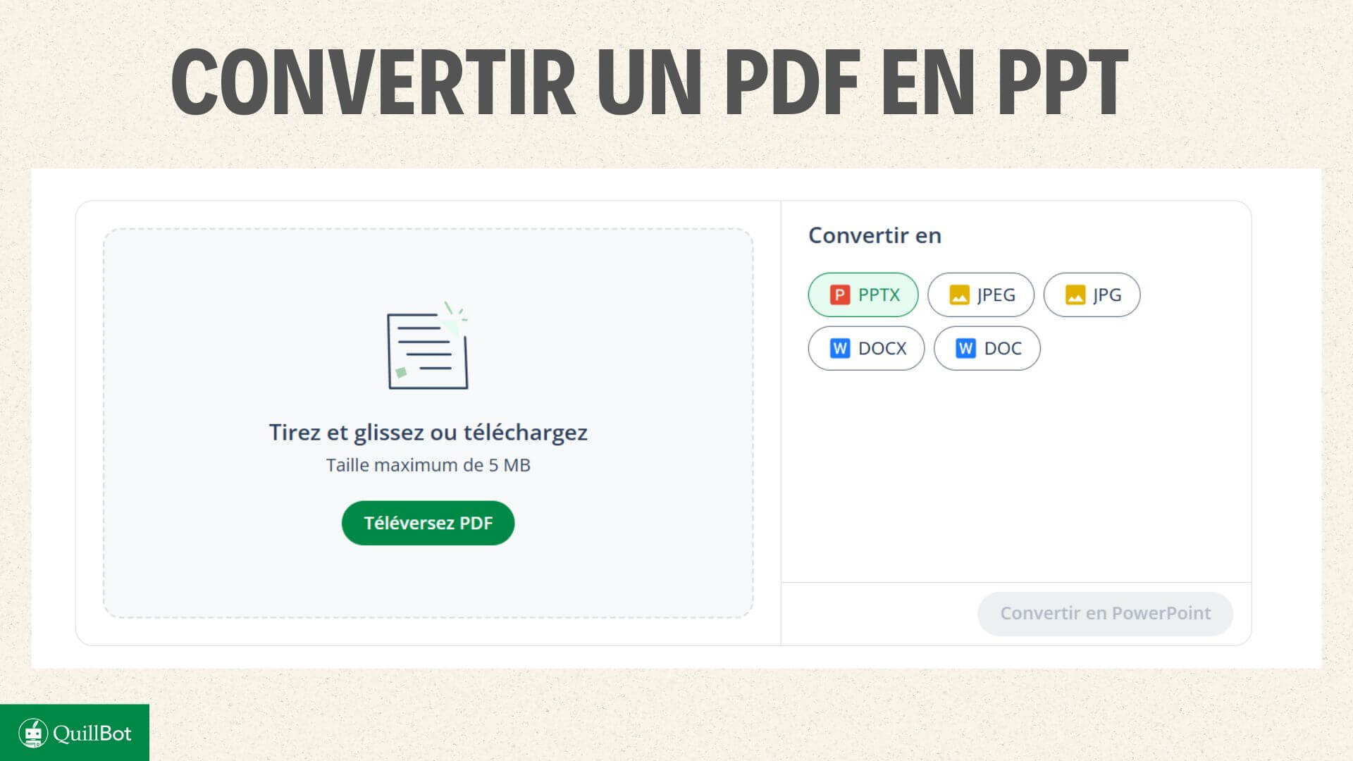 Et si vous souhaitez convertir un PPT en PDF, vous pouvez utiliser le convertisseur gratuit PPT en PDF de QuillBot.
