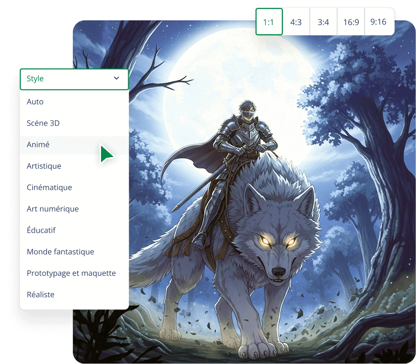Quel que soit le style souhaité, réaliste, anime, aquarelle, cinématographique, cyberpunk, 3D, et plus, obtenez des images parfaites pour vos projets, affiches et produits.