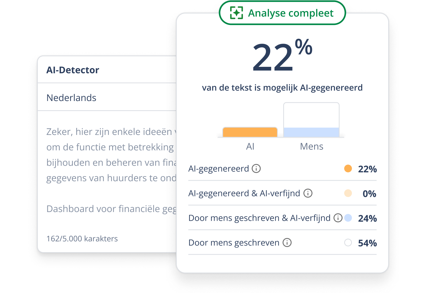 Teksten zijn tegenwoordig zelden 100% menselijk of AI. Onze detector begrijpt dit en oordeelt eerlijk.